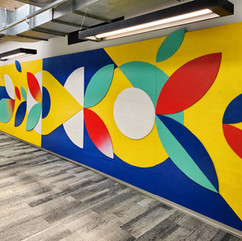 Esse trabalho é uma continuação do projeto de ambientação, que inclui murais, painéis volumétricos em madeira e esculturas, que realizo para eles desde 2016, quando construíram o complexo de escritórios chamado de MeliCidade